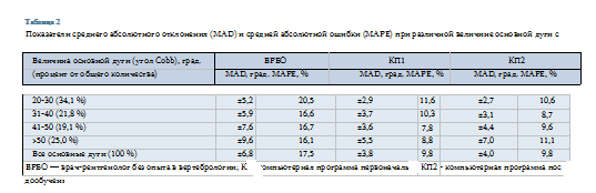 Данные таблицы показывают, что КП2 по всем основным дугам дает среднее абсолютное отклонение в ±4,0°, причем наименьшее отклонение в ±2,7° при величине дуги от 20 до 30°, программа ошибается в 10,6 % случаев. Меньше всего КП2 ошибается при величине дуги 31-40° (8,7 %). Средняя абсолютная ошибка КП2 по всем основным дугам определена в 9,8 %, что идентично КП1, но более чем в два раза ниже чем у исследователя ВРБО (17,5 %). Что касается дуг с 41° и выше, то КП2 по точности незначительно уступает КП1 - на 1,8 % (при дуге 41—50°) и на 2,3 % (при дуге >50°), однако превосходит точность ВРБО на 5 % и более.