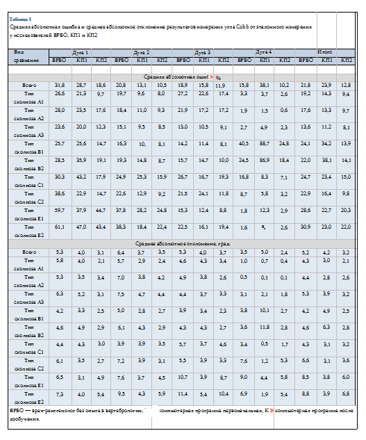 Среднее абсолютное отклонение результатов измерения угла Cobb, полученное зарубежными исследователями, составляет ±3,19° [13]; ±3,3° [14]; ±3,52° [15]; ±5° — в 88,7 % случаев [16]; менее 5° — в 95,9 % случаев [17].