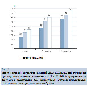 Так, по всем дугам сколиоза доля совпадений КП2 при погрешности в 3° возрастает до 70 %, при погрешности в 5° (клиническая приемлемость [2, 3]) — 84 %. При этом доля совпадений КП1 при погрешности в 5° определена в 75 %, а ВРБО — в 66 %.
