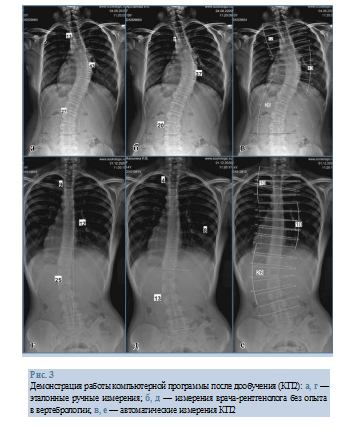 Измерения ВРБО существенно отличались от эталона — от 4 до 12°. Программа правильно определила и оценила все имеющиеся дуги деформации, разница между эталонным и автоматическим измерением угла Cobb составила 1—2° и определена как несущественная.