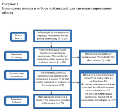 Поиск материалов осуществлялся по базам данных PubMed, eLIBRARY.RU по запросам: «sacral fractures», «sacroiliac screw», «spino- pelvic stabilization», «lumbopelvic fixation» и их русскоязычной интерпретации. Глубина поиска — 11 лет (2011—2022 гг.) Критерии включения: полнотекстовые работы; тематика в рамках специальности травматология и ортопедия; соответствие работ уровню доказательности 1—4 (по UK Oxford, версия 2009) — мета-анализы, клинические наблюдения, рандоминизи- рованные исследования, систематизированные и несистематизированные обзоры, анализ серии случаев. Критерии исключения: иной временной период публикации, тематика лечения сопутствующей патологии, описание единичных случаев, отсутствие доступа к полному тексту публикации.
