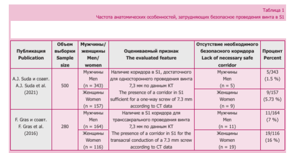 Крестец представляет собой отдел позвоночника, состоящий из 5 позвонков, которые в процессе онтогенеза, срастаясь вместе, образуют единую структуру с кифо- тическим углом наклона от 10 до 90° [3, 15, 19]. Осевая нагрузка тела перераспределяется от позвоночного столба на крестец, оттуда через крестцово-подвздошные сочленения — к нижним конечностям [2, 18]. Задние отделы обеспечивают до 60 % стабильности тазового кольца [1, 17]. Дополнительную прочность придает мощный связочный аппарат [9, 17]. L5—S1 является переходом от позвоночного столба к тазовому кольцу [20]. Изучение внутренней архитектуры по данным компьютерной томографии (КТ) показало, что наибольшую плотность имеют передние отделы S1 [18]. Это, в свою очередь, обеспечивает наибольшую стабильность фиксации в S1. При необходимости дополнительной стабильности фиксация может быть дополнена проведением винтов в S2, где плотность ниже в среднем на 89 HU [18, 21]. Особое внимание обращает высокая частота встречаемости вариантов дисморфизма крестца — 30 % [3]. Это очень важно для предоперационного планирования. При этом анатомические исследования показали, что величины «коридора безопасности», как правило, достаточно для проведения одного винта в S1 даже при наличии дисморфизма [18, 22]. Кроме того, в работах, оценивающих наличие в S1 «костных коридоров», достаточных для проведения одностороннего илиосакрального винта или встречных винтов, на достаточно объемных выборках [22, 23] оценена частота дисморфизма, делающая проведение илиосакральных винтов в S1 невозможным (табл. 1).