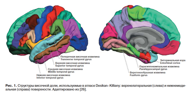 Процесс обработки также включал в себя автоматизированную топологическую коррекцию, сферизацию поверхности и регистрацию в сферическом атласе [25]. Для парцелляции коры головного мозга применялся встроенный атлас (атлас Desikan-Killiany), разделивший кортикальную поверхность на области в каждом полушарии [26]. Стандартный атлас ASEG (Automatically Segmented Brain Volume) обеспечил автоматическую маркировку подкорковых структур, включая гиппокамп и миндалевидное тело [24]. Анализ объема (в мм3) субкортикальных структур височных долей проводился с использованием схемы парцелляции HBT (Head, Body, Tail) [27].