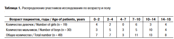 лет - 5, 12 лет - 1, 13 лет - 3, 14 лет - 2, 15 лет - 3, 16 лет - 2, 17 лет - 1 человек. Распределение по полу и возрастным интервалам представлено в табл. 1. Исследование проводилось с письменного согласия родителей пациентов. Анестезиологическое обеспечение применялось в случаях невозможности проведения исследования без анестезии.