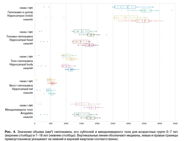Полученные нами результаты согласуются с данными предыдущих исследований, демонстрирующих асимметрию полушарий головного мозга. В частности, мы наблюдали большую величину правой височной доли и правого гиппокампа по сравнению со структурами с контралатеральной стороны [11]. Быстрый рост гиппокампа в раннем младенчестве может рассматриваться как потенциальная уязвимость к воздействию окружающей среды в этот период. Симметричное увеличение объемов гиппокампа и его субполей в обоих полушариях указывает на сбалансированное развитие этих структур, а отсутствие ведущего субполя в увеличении объема гиппокампа свидетельствует о равномерном росте всех его компонентов. Полученные в ходе исследования результаты согласуются с существующими литературными данными: равномерное увеличение всех субполей гиппокампа может свидетельствовать о пропорциональном развитии различных функций, связанных с памятью и пространственной ориентацией [32, 33]. Наше исследование показало соразмерное увеличение объема миндалевидного тела и гиппокампа, что свидетельствует о взаимосвязанном развитии этих лимбических структур. Полученные данные могут быть полезны для выявления аномалий гиппокампа и височных долей у детей. Кроме того, мы обнаружили, что объем головного мозга у мальчиков больше, чем у девочек, что соответствует результатам других исследований [34].