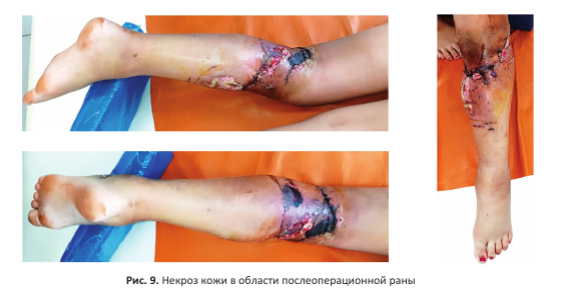 На 10-е сутки выявлен участок некроза кожи по задне-медиальной поверхности голени с выделением мутного серозного отделяемого из послеоперационной раны. Частично сняты швы, рана санирована, установлены выпускники (рис. 9).