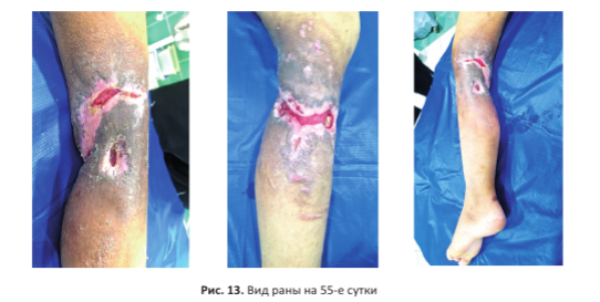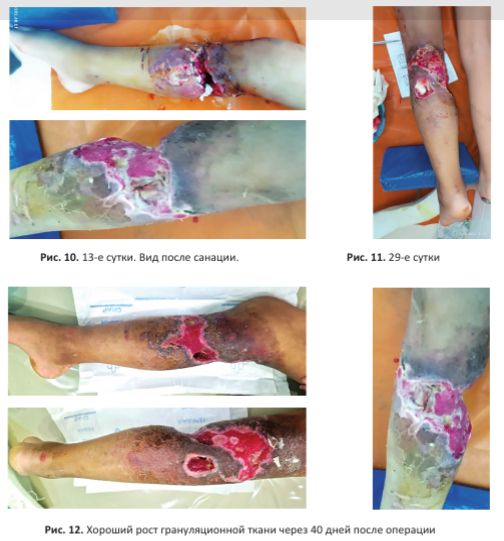 Бактериологическое исследование раневого отделяемого выявило рост Acinetobacter spp. Все швы были распущены, рана полностью раскрыта. Отмечался некроз мышц по задней поверхности голени, выявлена полость, содержащая мутное серозное отделяемое. Проведено иссечение визуально нежизнеспособных участков мышц и сухожилий. Выполнялась ежедневная двукратная санация полости антисептическими растворами. Пациентка получала анальгетики, антибиотики широкого спектра действия, антикоагулянты и железосодержащие препараты.