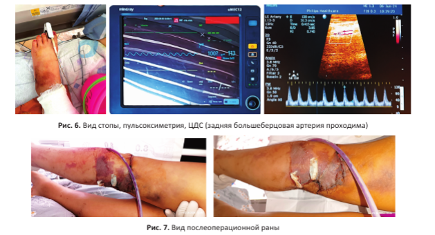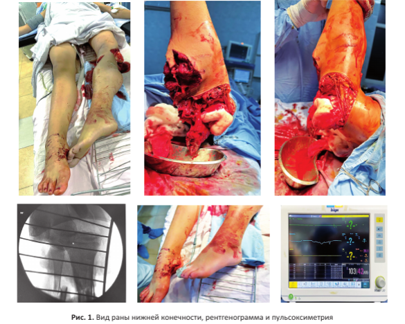 Вид повреждённой конечности, рентгенограмма при поступлении и данные пульсокси- метрии представлены на рисунке 1.