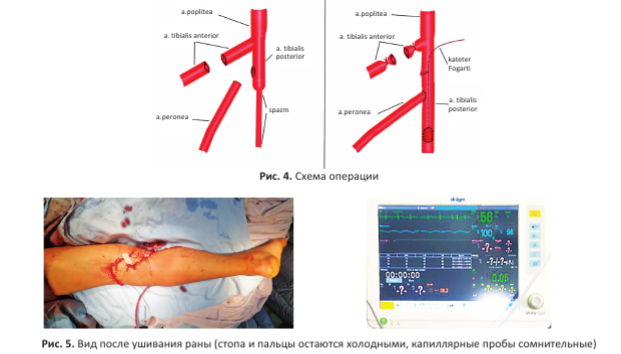 Отмечены отрыв передней большеберцовой артерии (ПББА) на уровне бифуркации подколенной артерии (ПА), отрыв малоберцовой артерии (МБА), контузия и травматический спазм задней большеберцовой артерии (ЗББА).