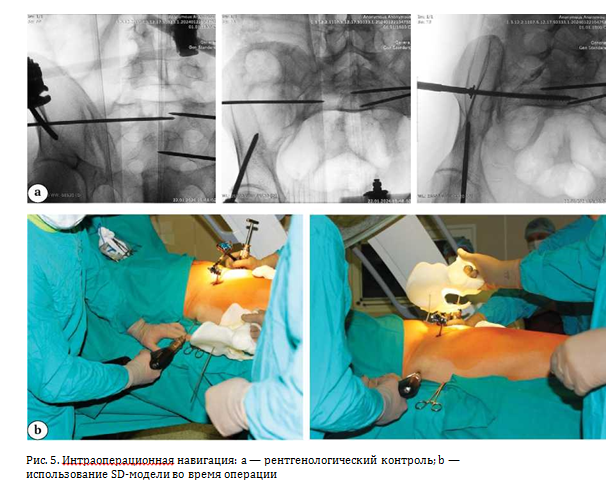 Рентгенологический контроль положения направляющих спиц, устанавливаемых имплантатов и их сравнение с 3D-моделью осуществлялись на протяжении всей операции в стандартных проекциях inlet, outlet, обзорной фронтальной, боковой, запирательной и подвздошной по Judet.