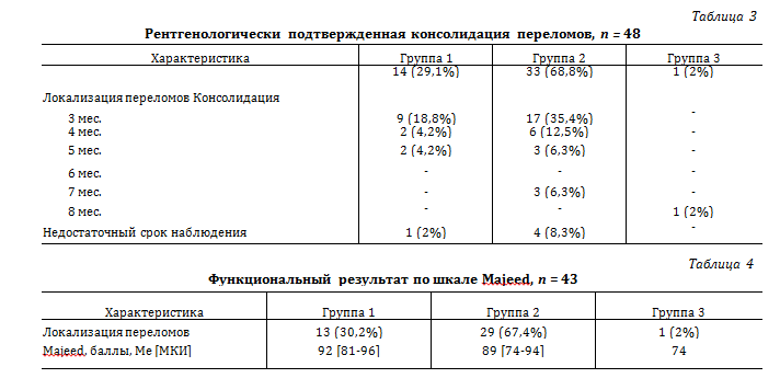 Общее количество оставшихся в исследовании пациентов составило 48 человек. На момент написания статьи рентгенологические признаки консолидации переломов отмечены в 43 (90%) случаях (13 пациентов из группы 1, 29 пациентов из группы 2 и у 1 пациента из группы 3), в остальных 5 (10%) случаях срок наблюдения был меньше среднего срока сращения (3 мес.) (табл. 3). Отдаленный функциональный результат через 8 мес. после операции по шкале Majeed представлен в таблице 4.