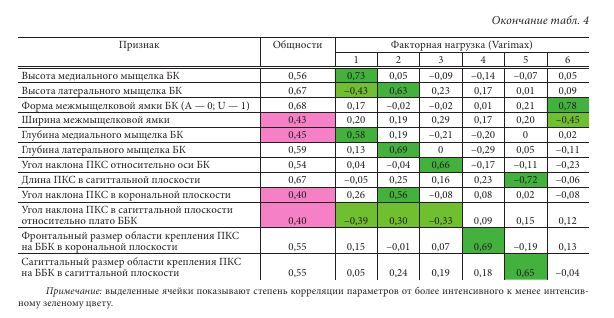 Первый фактор с наибольшей общностью (28,89 % от общей дисперсии) объединяет гендерно-детерминированные параметры коленного сустава. Второй по значимости фактор с 8,35 %-м вкладом в общую дисперсию включал пять составляющих: глубина плато большеберцовой кости, высота и глубина латерального мыщелка бедренной кости, что влияло на угол наклона ПКС в сагиттальной и корональной проекции. С третьего по шестой факторы представлены в табл. 4.