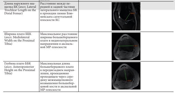 Нами выбран метод МРТ для измерения отдельных параметров КС, т. к. он является доступным и часто применяемым для диагностики патологий сустава и планирования хирургических вмешательств на КС. С помощью МРТ в рутинной практике перед реконструкцией ПКС хирург может оценить сопутствующие повреждения менисков, хряща и связок КС, выраженность дегенеративных изменений сустава, а также толщину и состояние зоны забора трансплантата связки [15, 16]. Немаловажную роль перед хирургическим вмешательством имеет оценка состояния костной ткани, а также размеров мыщелков БК и ББК для планирования формирования длины каналов. Однако с помощью МРТ КС невозможно достоверно оценить область прикрепления ПКС, в особенности бедренного прикрепления связки, и спланировать центр формирования каналов для анатомического размещения трансплантата.
