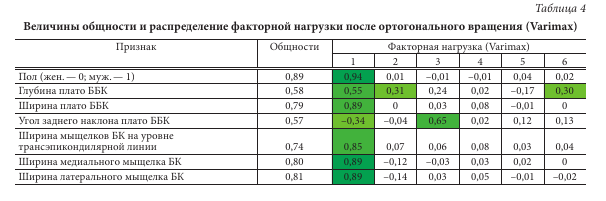 С помощью метода вращения Varimax первичных факторных структур получены и интерпретированы простые факторные структуры на основе метрических параметров коленного сустава (табл. 4). Целью вращения является получение простой структуры, которой соответствует большое значение нагрузки каждой переменной только по одному фактору и малое по всем остальным факторам. Нагрузка в этом случае отражает связь между переменной и фактором, являясь подобием коэффициента корреляции. Значение нагрузки лежит в пределах (-1; 1). После поворота осей переменные оказываются вблизи осей, что соответствует максимальной нагрузке каждой переменной только по одному фактору. Такое исследование позволило выявить латентные интегративные характеристики сустава, обусловленные единым фактором.