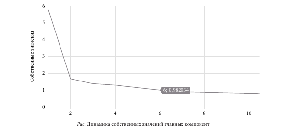 С учетом наличия мультиколлинеарности между признаками дальнейший факторный анализ выполнялся методом главных компонент для сокращения числа переменных на основе их классификации и определения структуры взаимосвязей между ними. Влияние главных компонент, собственные значения которых численно равны дисперсии соответствующих главных факторов, на динамику целевых и базовых факторов представлено на рисунке.