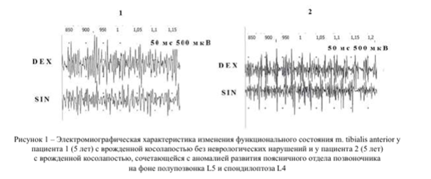 На рисунке 1 видно, что при попытке произвольного напряжении мышц голеней (m. tibialis anterior) у пациента (2) с врожденной косолапостью стоп, сочетающейся с врожденной аномалией развития поясничного отдела позвоночника на фоне полупозвонка L5 и спондилоптоза L4, регистрировалась значительно сниженная БА с признаками изменения структуры по редуцированному типу. Указанный электрофизиологический паттерн расценивали как компенсаторный тип изменения ЭМГ, отражающий функциональную реорганизацию двигательных единиц мышц голеней в условиях ограничения подвижности конечности и десинхронизации проведения эфферентной импульсации по нервным проводникам.