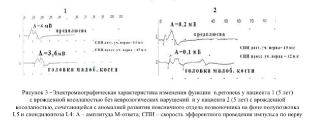 Врожденная косолапость стоп различного генеза сопровождается изменением функционального состояния нервно-мышечной системы, характеризующимся снижением двигательной функции мышц голеней и стоп и моторной проводимости соответствующих периферических нервов, а также признаками моторной недостаточности пояснично-крестцовых корешков СМ, выраженность которых доминирует у пациентов с врожденной аномалией развития поясничного отдела позвоночника.