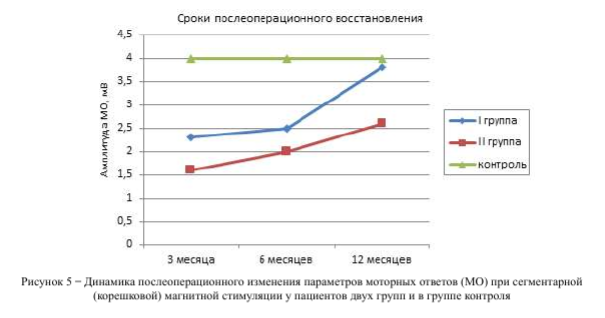 Восстановление характеристик БА отмечали не раннее, чем через 3 месяца после оперативного лечения. Реабилитационные мероприятия проводили с учетом функционального состояния нервно-мышечного аппарата. У пациентов I группы через 3 месяца отмечали постепенную нормализацию электрофизиологических параметров МО, М-ответов и Н-рефлекса, которая продолжалась на протяжении 12 месяцев. Стабилизация этих процессов позволяла сделать вывод о восстановлении функций и завершении реабилитации.