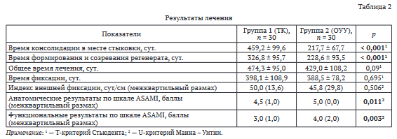 Полученные показатели демонстрируют принципиальные преимущества методики ОУУ перед ТК при лечении огнестрельных дефектов большеберцовой кости: