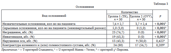Частота осложнений между группами существенно различалась. Незначительные осложнения чаще встречались в группе ТК, — (7,6 ± 2,7) случаев на одного пациента за время лечения против (3,7 ± 2,4) в группе ОУУ (p < 0,001). Серьезные осложнения также преобладали в группе ТК, — 5,0 (3,0) случаев против 0 (1,0) в группе ОУУ (p < 0,001). Несращение наблюдали исключительно в группе ТК, — 23 (76,7 %) случая против полного их отсутствия в группе ОУУ (p < 0,001). Это критически важное различие указывает на принципиальную проблему методики ТК, — высокий риск формирования ложных суставов в месте контакта. Инвагинация также была характерна только для группы ТК, — 19 (63,3 %) случаев (p < 0,001), что является специфическим осложнением данной методики. Такое распределение осложнений объясняется длительным периодом перемещения фрагмента(-ов) после остеотомии до момента контакта при ТК и необходимостью дополнительных хирургических вмешательств для устранения препятствий к сращению. Различия по частоте других осложнений (нарушение оси и контрактуры суставов) были статистически незначимы. Однако эти осложнения отразились на анатомических и функциональных результатах (табл. 3).