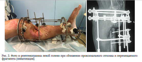 После стабилизации состояния и заживления ран на левой голени (рис. 1) через 72 дня после ранения провели операцию: внеочаговый чрескостный компрессионно-дистракционный остеосинтез (ВЧКДО) по Илизарову левой голени, остеотомия дистального отломка левой большеберцовой кости. Дефект большеберцовой кости — 15 см. На 79-е сутки после ранения начали перемещение фрагмента с целью формирования регенерата и замещения дефекта. На 164-е сутки после ранения (85 суток после остеотомии) для коррекции положения и направления перемещения фрагмента выполнили перемонтаж аппарата Илизарова на левой голени. Продолжили перемещение фрагмента дистального отломка большеберцовой кости (рис. 2).
