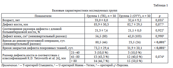 У 19 пациентов из группы 2 закрытие раны осуществляли местными тканями одновременно с острым укорочением (ОУ), у восьми человек дополнительно применяли методы местной пластики и у трех — расщепленный кожный трансплантат. Необходимость предварительного проведения дополнительной операции в группе ТК обусловила существенные различия в сроках выполнения реконструктивной операции. При проведении ТК реконструктивная операция (остеотомия) выполнена в среднем на 80,5 (46) сутки, а при ОУУ (сближение отломков) — на 23,5 (26) сутки (р < 0,001).