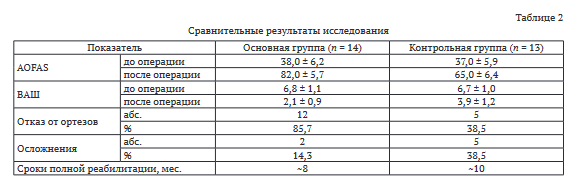 В контрольной группе, где проводили артродез или изолированный тенодез, также наблюдали улучшение, но оно было менее выраженным. Средний показатель AOFAS увеличился с (37,0 ± 5,9) до (65,0 ± 6,4) баллов, а ВАШ снизился до (3,9 ± 1,2) балла. При этом у восьми (61,5 %) пациентов сохранялась необходимость в ортезировании, выраженная при длительной ходьбе или физических нагрузках. Продолжительность полной реабилитации была в среднем на два месяца длиннее, чем в основной группе.