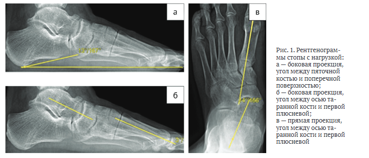 Каждому пациенту, участвующему в исследовании, при госпитализации и через год после операции проводили рентгенологическое исследование стопы с нагрузкой в двух проекциях (прямой и боковой).