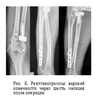 После хирургического вмешательства пациент проходил реабилитацию на протяжении шести месяцев. Контрольные рентгенограммы и компьютерная томография выполнили через полгода с момента операции. На рентгенограммах предплечья отметили срастающийся перелом локтевой кости (рис. 8).