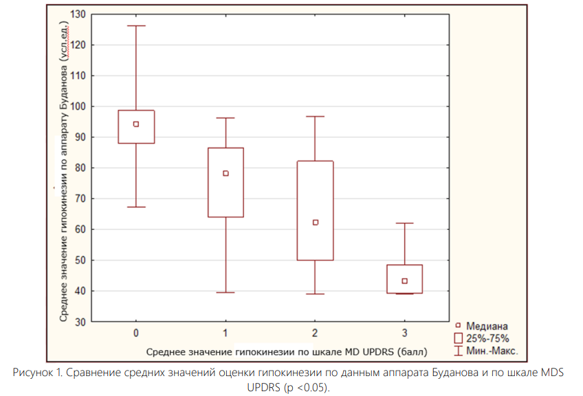 Цель исследования - оценить диагностическую значимость аппарата В.М. Буданова в объективизации гипокинезии у пациентов с БП в сравнении со стандартной шкалой MDS UPDRS.