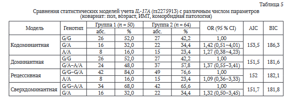 Далее проведен анализ данных сравнения статистических моделей с различным числом параметров (ковариат: пол, возраст, ИМТ, коморбидная патология). Полученные результаты представлены в таблицах 4 и 5.