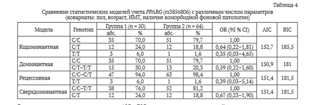 Выяснили, что наименьшие значения AIC и BIC критериев — в доминантной модели, которая включает в себя генотип С/С и С/Т-Т/Т, что также может влиять на риск рецидива осложнения.