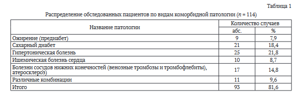 Таким образом, отобрано 114 пациентов, пролеченных на базе больницы имени Н.В. Соловьева (Ярославль) в различные периоды с 2018 по 2024 гг. Коморбидные патологии выявлены у 93 (81,6 %) пациентов (табл. 1).