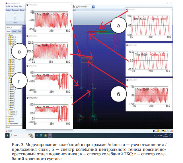 Обследование проведено в соответствии с общепринятыми этическими принципами, нормами и правилами проведения научных исследований, регламентированных Хельсинской декларацией Всемирной медицинской ассоциации 1964 г., Федеральным законом № 323 «Об основах охраны здоровья граждан в Российской Федерации» от 21.11.2011, Федеральным законом N 152 «О персональных данных» от 27.07.2006. РЕЗУЛЬТАТЫ С использованием программы Adams проведено моделирование колебаний при выключении отдельных узлов/суставов (по типу пассивного замыкания в сгибательной контрактуре) (рис. 3). Получено визуальное подтверждение высокой синхронизации колебаний ПКО позвоночника и ТБС как при одностороннем «замыкании» с нарастанием мощности колебаний почти в два раза (рис. 3, б, в), так и при двустороннем «замыкании» с нарастанием колебаний в нижележащих уровнях баланса (рис. 3, в, г). Установлено значимое влияние на БВС (с усилением мощности колебаний во фронтальной плоскости) пери- и параартикулярных механизмов компенсации, — корреляционный анализ по критерию Спирмена показал значимую корреляцию средней заметной и сильной высокой степеней взаимосвязи положительной направленности (при р ≤ 0,05) по показателям Jerk r = 0,64; PWR r = 0,7 и F50 r = 0,70.