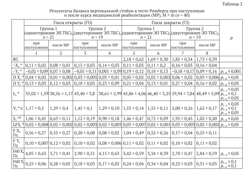 При схожих реакциях на мероприятия двигательной реабилитации в группе двустороннего ЭП ТБС установлены более стабильные и функционально значимые изменения с тенденцией улучшения статокинетической устойчивости по энергоэффективному «центральному» варианту с усилением вклада А-синергий в БВС. Наглядно показано, что в раннем реабилитационном периоде более устойчивые функциональные изменения с формированием физиологических колебаний преимущественно в сагиттальной плоскости (голеностопная, центральная А-стратегия) формируются в группе двустороннего ЭП ТБС за счет улучшения проприоцептивной чувствительности (проба Ромберга с закрытыми глазами до и после курса медицинской реабилитации, — табл. 2 столбцы 8 и 9).