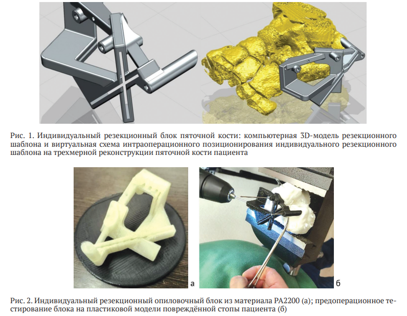 На первом этапе готовят индивидуальный резекционный шаблон, который впоследствии будет применен при хирургическом вмешательстве. Для этого с использованием проектировочного программного обеспечения на основе результатов МСКТ-исследования пациента создают виртуальную модель пяточной кости (рис. 1). В ходе второго этапа методом 3D-печати по технологии FDM из пластмассы (PA2200) изготавливают собственно резекционный блок (рис. 2, а), который тестируют на пластиковом макете поврежденной стопы для проверки конгруэнтности поверхностей изделия и анатомических структур стопы (рис. 2, б). Готовый имплантат стерилизуют методом газовой стерилизации оксидом этилена в соответствии с ГОСТ ISO 11135 при температуре от 30 до 55 °C.