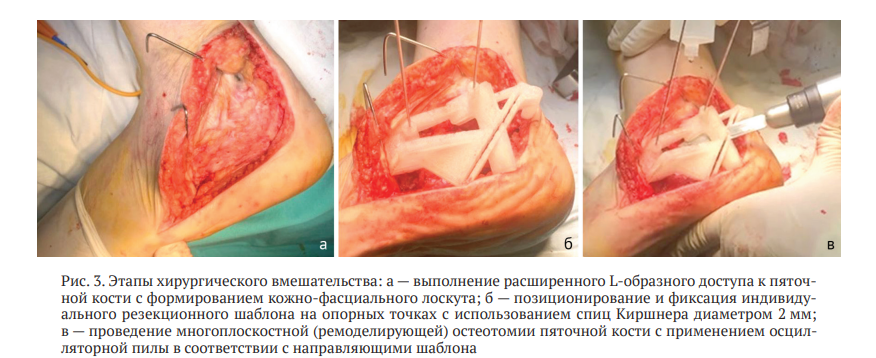 Ногу обрабатыватывают в условиях чистой операционной в положении на здоровом боку с обескровливанием конечности путем наложения пневможгута. Обработку операционного поля проводят согласно стандартному протоколу, включающему двукратную антисептическую подготовку кожи раствором повидон-йода (10 %) или хлоргексидина биглюконата (0,5 %). В пяточной области выполняют L-образный доступ к пяточной кости, послойно рассекают кожу, подкожно-жировую клетчатку, фасцию, избегая повреждения икроножного нерва. Проводят скелетирование пяточной кости единым кожно-фасциальным лоскутом до обнажения ее латеральной стенки, дистального полюса малоберцовой кости и подтаранного сустава. Выполняют установку индивидуального резекционного шаблона на выбраные в ходе предоперационного планирования точки фиксации с помощью спиц Киршнера диаметром 2 мм.