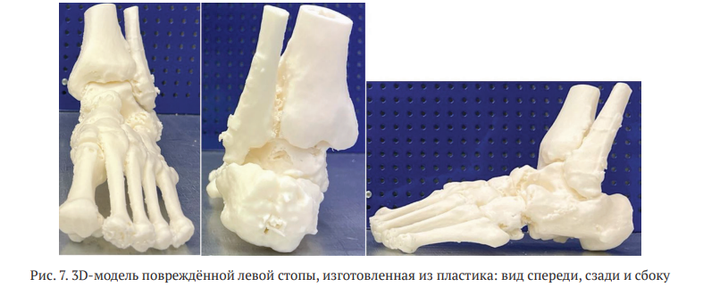 Для углубленного изучения пространственных характеристик фрагментов пяточной кости была изготовлена её пластиковая модель на основе трёхмерной реконструкции с использованием технологии 3D-печати. Данный подход позволил применить визуально-тактильный метод анализа, способствующий более детальному пониманию повреждения (рис. 7).