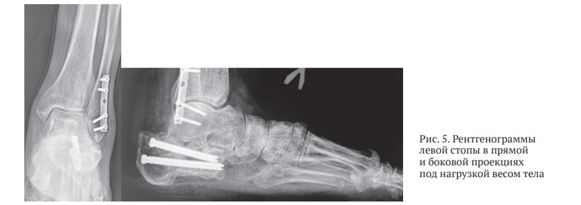 Для оценки результатов лечения использованы данные рентгенографии, мультиспиральной компьютерной томографии (МСКТ), а также шкалы и опросники оценки функционального и клинического состояния стопы и голеностопного сустава: AOFAS Ankle-Hindfoot (англ.: American Orthopedic Foot & Ankle Society), EFAS (англ.: European Foot and Ankle Society), FFI (англ.: Foot Function Index) и визуальная аналоговая шкала боли VAS [17–20].