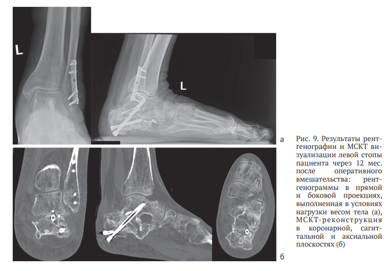 В течение месяца осевая нагрузка на конечность была полностью восстановлена, что позволило пациенту вернуться к трудовой деятельности. Динамическое наблюдение за пациентом продолжали, окончательный результат лечения оценен через 12 месяцев после операции. На контрольном осмотре отмечено сохранение достигнутой коррекции заднего отдела левой стопы, отсутствие латерального пяточно-малоберцового импиджмента, восстановление угла отклонения таранной кости, угла наклона пяточной кости, угла Мири, лодыжечного роста и ширины пяточной кости (рис. 9, а). Результаты МСКТ демонстрировали консолидированный артифициальный перелом левой пяточной кости с формированием подтаранного костного блока в условиях фиксации винтами, а также консолидированный перелом малоберцовой кости в условиях фиксации блокируемой пластиной (рис. 9, б).