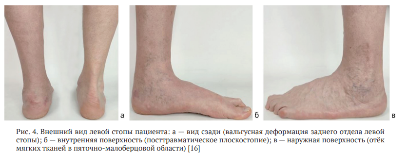 На момент обращения пациент предъявлял жалобы на выраженный болевой синдром в заднем отделе левой стопы, локализующийся в области подтаранного сустава и полюса малоберцовой кости, а также на снижение функциональной активности. Способность к самостоятельному передвижению была не более 3000 шагов в день, после чего пациент был вынужден принимать нестероидные противовоспалительные препараты для снижения болевого синдрома. Пациент также стал отмечать прогрессирующее ограничение тыльного сгибания в левом голеностопном суставе и дискомфорт при подборе и ношении стандартной обуви, что было обусловлено сохраняющейся деформацией заднего отдела левой стопы (рис. 4). Указанные жалобы свидетельствовали о сохранении функциональных нарушений в левой стопе, требующих углубленного диагностического исследования и комплексного нетривиального подхода к определению дальнейшей тактики лечения.