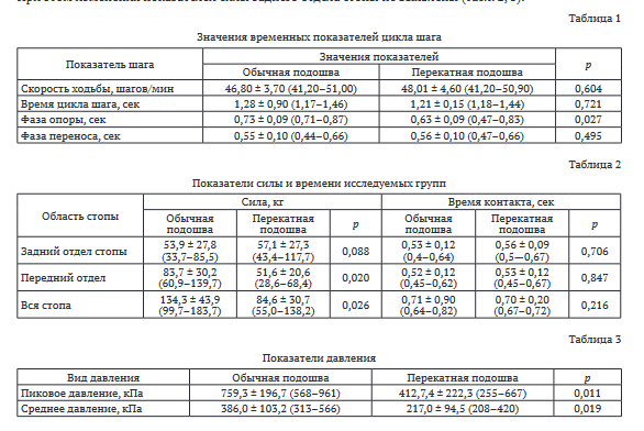 Выявлено статистически значимое снижение значений показателей пикового и среднего давления, времени фазы опоры при ходьбе в обуви с перекатной подошвой в сравнении с обычной обувью. При анализе показателей силы отмечена разница общей силы и силы в переднем отделе стопы. При этом изменения показателей силы заднего отдела стопы не выявлены (табл. 2, 3).