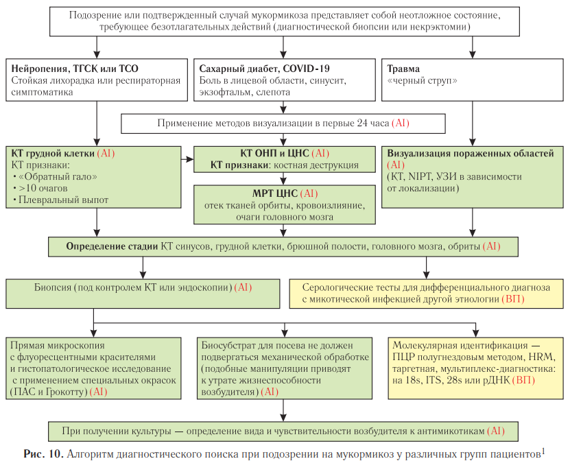 Современные клинические рекомендации предлагают обязательное исследование с помощью МСКТ зоны поражения инфекцией для постановки диагноза и оценки степени распространенности микотического процесса [2, 22]. На рис. 10 представлен алгоритм лучевого обследования у различных групп пациентов с подозрением на мукормикоз.
