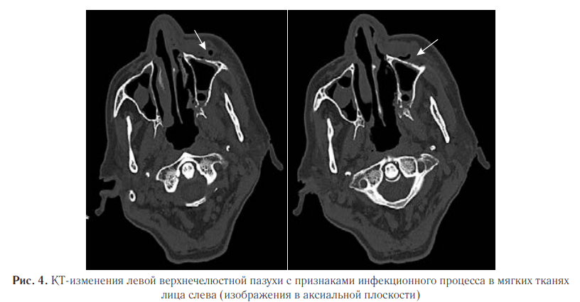 В левой верхнечелюстной пазухе наблюдали деструкцию и истончение переднелатеральной стенки, а также отек и утолщение мягких тканей лицевой области слева с пузырьками воздуха (рис. 4).