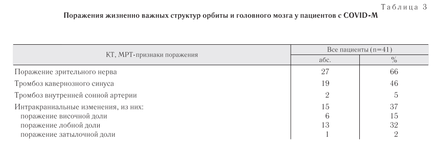 В исследование включили 41 пациента с рино-орбито-церебральным мукормикозом. Все пациенты были взрослыми в возрасте от 22 до 83 лет, медиана возраста составила 61±2,34 года. Из них мужчин — 56%, женщин — 44%. Основными фоноПоражение стенок верхнечелюстных пазух выявлено у 100% пациентов, стенок и ячеек решетчатой кости — 93%, стенок лобной пазухи — 37%, стенок основной пазухи и клиновидной кости — 83%, стенок орбит — 95%, верхней челюсти — 85%, нижней челюсти — 5% (табл. 2), отек, утолщение мягких тканей лица, орбиты и ЦНС — 93%, эмфизема мягких тканей лица, орбиты и головного мозга — 73% (см. табл. 1), поражение зрительного нерва — 66%, поражение лобной доли — 32%, поражение височной доли — 15%, поражение затылочной доли — 2%, тромбоз кавернозного синуса — 46%, внутренней сонной артерии — 5% (табл. 3).