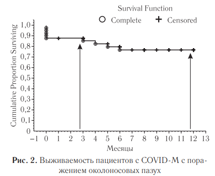 Антимикотическую терапию получали 95% всех пациентов. Проведенный анализ показал, что чаще всего для лечения мукормикоза околоносовых пазух использовали липосомальный амфотерицин B (46%), позаконазол (33%) и изавуконазол (22%). Комбинированную терапию применяли в 46% случаев. Средняя продолжительность антимикотической терапии была 55,1 дня. Хирургическое лечение с удалением очагов остеомиелита и пораженных участков мягких тканей проводилось у 98% пациентов. Общая выживаемость пациентов с COVID-M после проведения хирургического лечения и антимикотической терапии в течение 3 месяцев составила 88% и в течение 1 года — 78% (рис. 2).