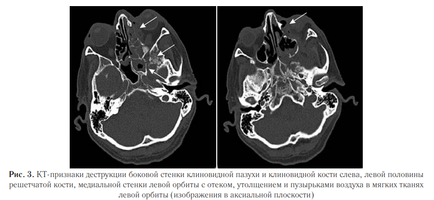 Пациент У., 1949 г.р., госпитализирован 09.2021 с жалобами на онемение левой половины лица, отек левого глаза, затруднение глотания твердой пищи, асимметрию лица. Из анамнеза известно, что заболевание началось 08.2021 с повышения температуры тела более 38°С, появились боль в горле, кашель, головокружение, отсутствие аппетита, снизилось обоняние. Пациент самостоятельно принимал парацетамол без улучшения состояния. 29.08.2021 потерял сознание, госпитализирован в областную больницу. Выполнено МСКТ головного мозга — данных, свидетельствующих об остром нарушении мозгового кровообращения (ОНМК), не получено. На МСКТ органов грудной клетки выявлена двусторонняя полисегментарная пневмония, выраженность изменений соответствует КТ-2. Диагностирована новая коронавирусная инфекция COVID-19, подтвержденная ПЦР. Проводили противовирусную терапию, вводили ГКС, антибиотики, антикоагулянты. Состояние ухудшилось через неделю, когда пациент стал отмечать онемение левой половины лица, отек в области левого глаза, асимметрию лица, затруднение приема пищи. Переведен в районную клиническую больницу, где на МСКТ головного мозга ОНМК вновь не подтвердилось, выявили двусторонний гайморит, флегмону левой орбиты и остеомиелит верхней челюсти слева. При осмотре оториноларингологом периостит верхней челюсти слева, при осмотре офтальмологом флегмона левой орбиты. Провели дренирование ретробульбарного пространства слева, конъюнктивотомию на 10-е сутки госпитализации. В анализах крови: нейтро- и лимфоцитопении не выявляли, повышение уровня глюкозы до 7,8 ммоль/л. Диагностирован сахарный диабет 2-го типа. На контрольной МСКТ ОНП выявили деструкцию и истончение медиальной стенки левой орбиты, ячеек решетчатого лабиринта, деструкцию боковой стенки клиновидной пазухи и клиновидной кости слева, утолщение и отек мягких тканей левой орбиты с пузырьками воздуха (рис. 3).