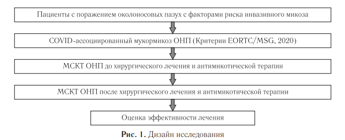 Для постановки диагноза инвазивного микоза использовали критерии Европейской организации по исследованию и лечению рака (EORTС) и группы, исследующей микозы MSGERC (США), 2020 [2]. Основным методом лучевой диагностики для постановки диагноза являлась мультиспиральная компьютерная томография. МСКТ околоносовых пазух проводили всем пациентам, применяли томографы GE Revolution HD, Philips Ingenuity Core 64, CTGE Bright Speed 16, Aquilion PRIME 1. Для просмотра КТ-изображений использовали программу Weasis v 4.5.0. В процессе изучения применен метод научного исследования путем разложения предмета исследования (КТ-семиотика) риноорбито-церебрального мукормикоза. Оценивали изменения слизистых оболочек, костных стенок ОНП, костей черепа, поражения структур лицевой области, орбиты и головного мозга. Статистический анализ данных выполняли с использованием пакета программ Microsoft Office Excel 2019. Анализ выживаемости проводили методом Каплана–Майера.